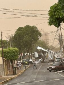 Tempestade de poeira com ventos de até 50 km/h atingiu Pompeia e região na manhã desta segunda-feira (22). A cidade registrou estragos: casas, empresas e prédios públicos foram destelhados, postes caíram, estruturas metálicas e portões foram ao chão. Por enquanto não informações de pessoas feridas.