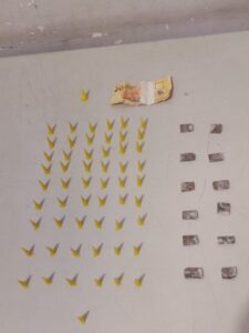 Porém, após receberem autorização para entrarem na casa, os policiais conseguiram pegar a sacola que foi arremessada: nela tinha mais drogas – 12 porções de maconha e 53 eppendorf’s de crack.