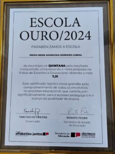 Quintana tem mais um grande motivo para se orgulhar! A EMEF Professora Neide Aparecida Sobreiro Lisboa foi reconhecida pelo Governo do Estado de São Paulo com o título de “Escola Ouro 2024”, após atingir nota 7,31 no Índice de Excelência Educacional, superando as metas propostas pelo programa Alfabetiza Juntos SP.