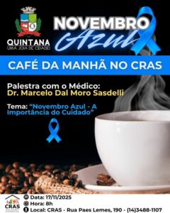 Com foco na prevenção e no cuidado com a saúde masculina, a Prefeitura de Quintana, sob a gestão do prefeito Fernando Itapuã, realiza neste mês uma série de ações em alusão à campanha Novembro Azul. O destaque será um Café da Manhã especial no CRAS, no dia 17 de novembro, com a presença do médico Dr. Marcelo Dal Moro Sasdeli, que ministrará a palestra “Novembro Azul – A Importância do Cuidado”.