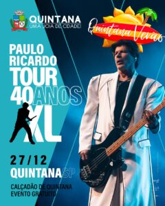 Pelo segundo ano consecutivo, o município de Quintana reafirma seu protagonismo cultural e sua capacidade de planejamento ao trazer para o festival Quintana Verão um dos maiores nomes da música brasileira: Paulo Ricardo, que apresenta a consagrada Turnê 40 Anos, no próximo dia 27 de dezembro, no Calçadão de Quintana, em um evento totalmente gratuito.