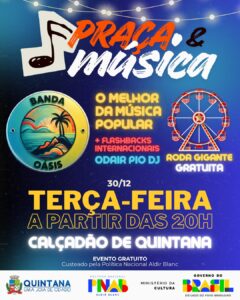 Hoje tem muito mais agito em Quintana, a cidade mais badalada da região neste final de ano. Sob a determinação do prefeito Fernando Itapuã (PSD), o Município tem oferecido uma programação bastante especial para seus moradores. A festa continua nesta terça-feira (30), com o projeto Praça & Música – com o melhor da música popular brasileira com a Banda Oásis e flashbacks internacionais – com presença de Odair Pio DJ, no Calçadão Municipal, a partir das 20 horas, totalmente de graça para todos curtirem.