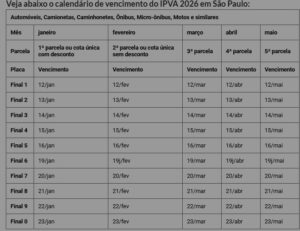 O ano de 2026 começou e com ele o novo calendário de vencimento do IPVA (Imposto sobre a Propriedade de Veículos Automotores). No estado de São Paulo, a primeira parcela ou desconto com cota única única inicia no dia 12 de janeiro e vai até o dia 23 de janeiro, a depender do final da placa. Isso para automóveis, caminhonetes, ônibus e motos.