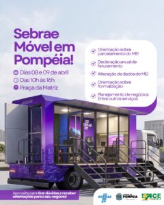 O Sebrae-SP, em parceria com a Associação Comercial e Empresarial de Pompeia e a Prefeitura Municipal, promove nos dias 8 e 9 de abril a ação Sebrae Móvel em Pompeia. O atendimento será realizado das 10h às 16h, na Praça Rui Barbosa, conhecida como Praça da Igreja Matriz, com o objetivo de levar orientação gratuita a empreendedores e pessoas interessadas em iniciar um negócio próprio.