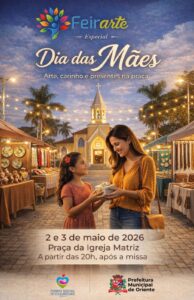 Oriente promove, nos dias 02 e 03 de maior, sábado e domingo, respectivamente, a FeirArte – Especial Dia das Mães. O evento acontecerá na Praça da Igreja Matriz, às 20 horas.