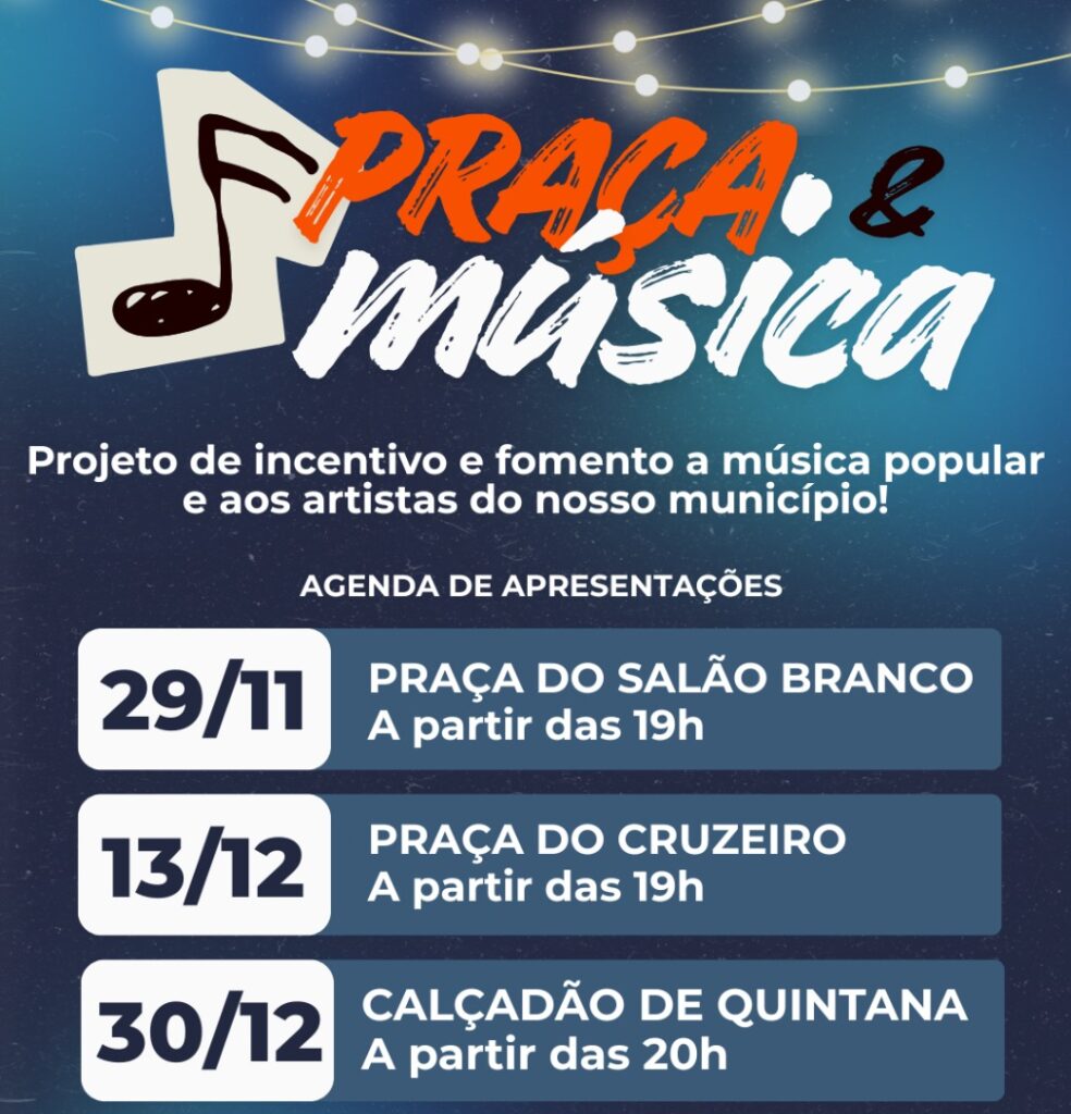 Quintana anunciou a realização do Projeto Praça & Música, uma iniciativa de incentivo e fomento à música popular e aos artistas do município, promovendo encontros especiais que celebram o talento local e o amor pela arte! A programação ficou assim definida: 29/11 – Praça do Salão Branco | A partir das 19h 13/12 – Praça […]