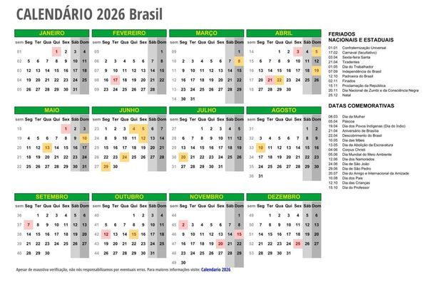 Em 2026, Brasil terá vários “feriadões” prolongados; confira o calendário oficial