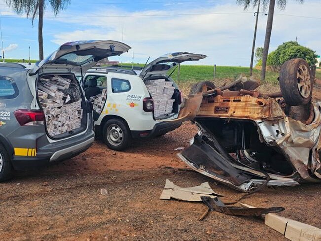Polícia Rodoviária encontra 24 mil maços de cigarros em carro capotado em estrada da região