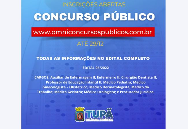 Estão abertas as inscrições para mais um Concurso Público (nº 06/2022) da Prefeitura de Tupã. Os cargos são para as áreas da saúde, educação ou direito, e exigem registro profissional ou ensino superior específico. A prova visa criação de cadastro reserva para: Auxiliar de Enfermagem II; Enfermeiro II; Cirurgião Dentista II; Professor de Educação Infantil […]