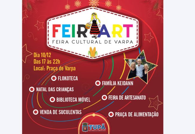 Acontece hoje (sábado, dia 10) mais uma edição do FeirArt, evento cultural realizado mensalmente no distrito de Varpa. A feira ocorre das 17h às 22h, na praça central defronte à Escola Estadual João Brediks, na Avenida Brasil. O evento contará com apresentações musicais da família Keidann, e também com a tradicional Feira de Artesanato e […]
