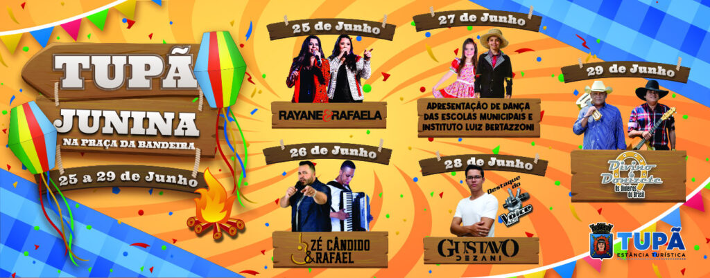 “Zé Pretinho” receberá atrações culturais de música e dança. Sábado (25), o Tupã Junina traz duas vozes do feminejo. Rayane & Rafaela vem se consagrando no gênero musical como cantoras e compositoras. O single do segundo álbum delas “Pancada de Choro”, já bateu três milhões de visualizações no YouTube. Domingo (26), haverá show de Zé […]