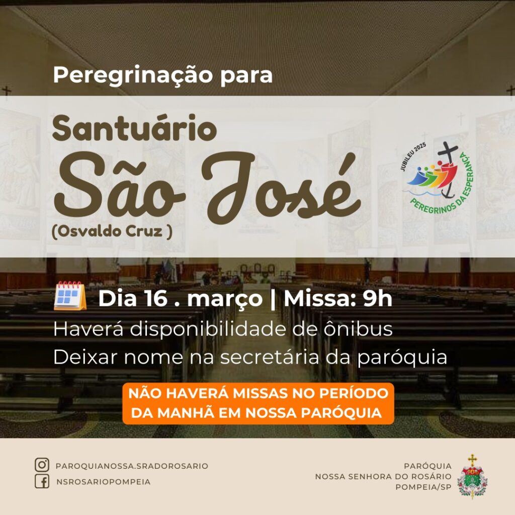 A Paróquia Nossa Senhora do Rosário de Pompeia disponibilizará um ônibus para os fieis que desejarem participar da peregrinação ao Santuário São José, em Osvaldo Cruz (90km de Pompeia). A Santa Missa acontecerá no domingo (16), às 9h. O ônibus é gratuito. Para garantir a vaga, o fiel deve deixar seu nome na secretaria da […]