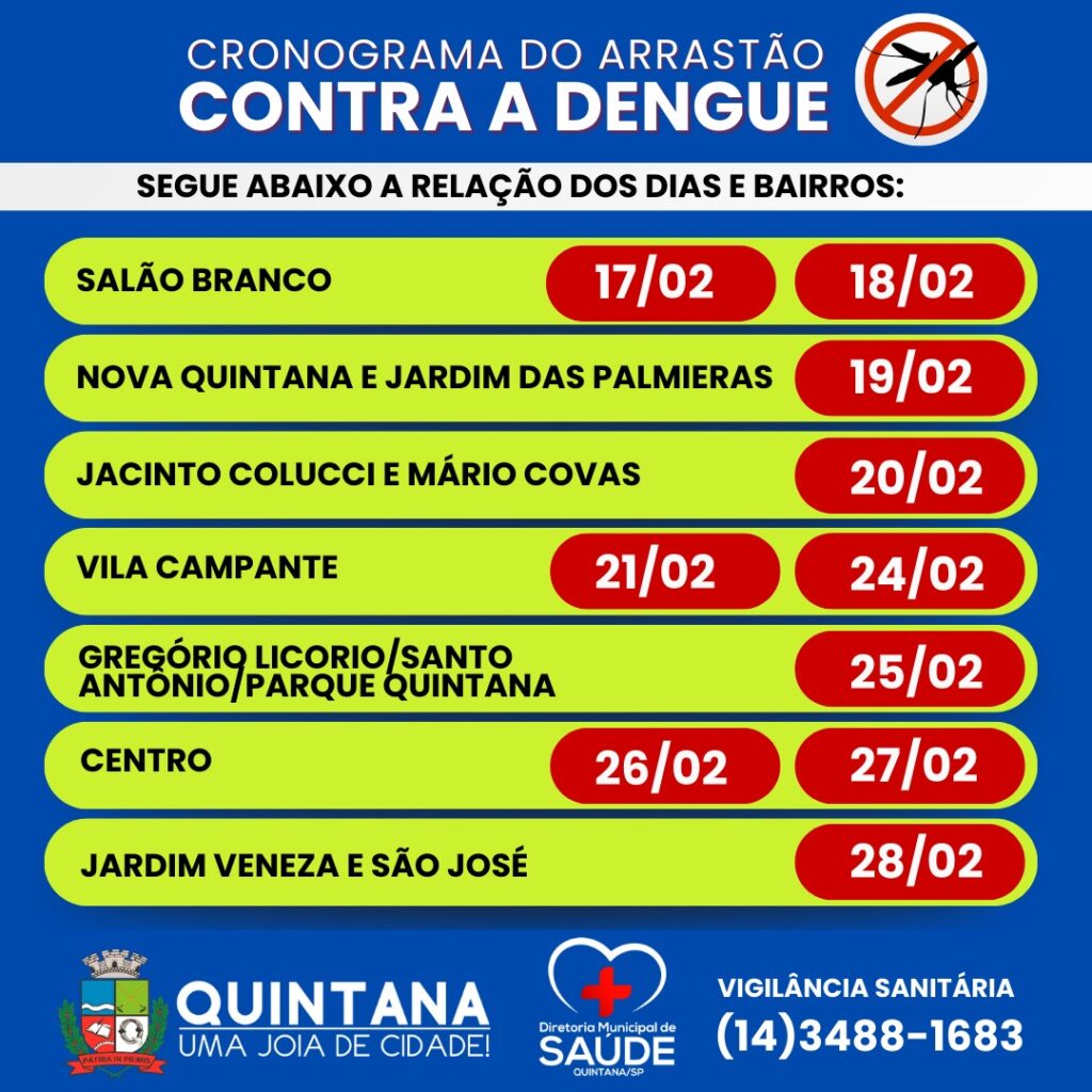 ATENÇÃO, QUINTANA | Segue o “arrastão contra a dengue”. A Prefeitura de Quintana está mobilizando a comunidade para combater a dengue e a sua participação é fundamental. quando o arrastão passará pelo seu bairro! Participe! Veja quando o arrastão passará pelo seu bairro. A ação é pela saúde e vida de todos os quintanenses. Cronograma: […]
